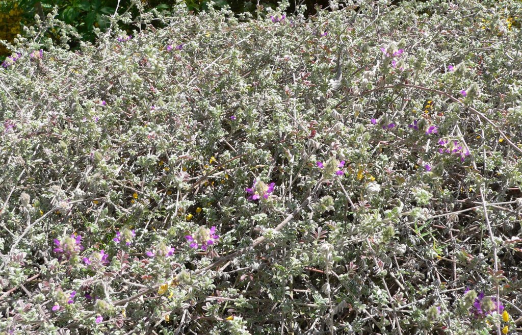 Teucrium chamaedrys ‘Prostratum,’ commonly referred to as Prostrate Germander, forms a low-growing groundcover with small, aromatic leaves and clusters of pink to lavender flowers; its dense and spreading growth habit, along with its drought tolerance and attractive foliage, make it an excellent choice for creating textured and fragrant groundcovers in various garden settings.