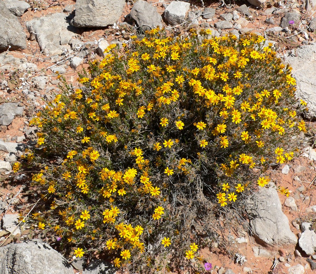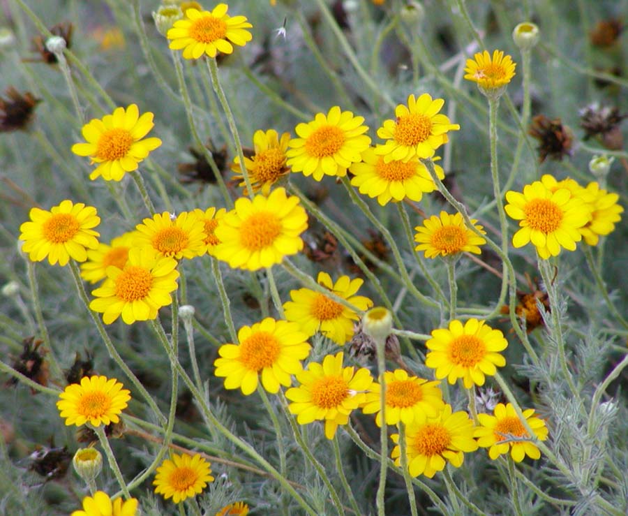 Thymophylla acerosa, commonly known as Pricklyleaf Dogweed, is a resilient desert plant characterized by feathery silver-gray foliage and bright yellow, daisy-like flowers; its ability to thrive in harsh, arid conditions and its charming floral display make it a valuable addition to xeriscapes and rock gardens.