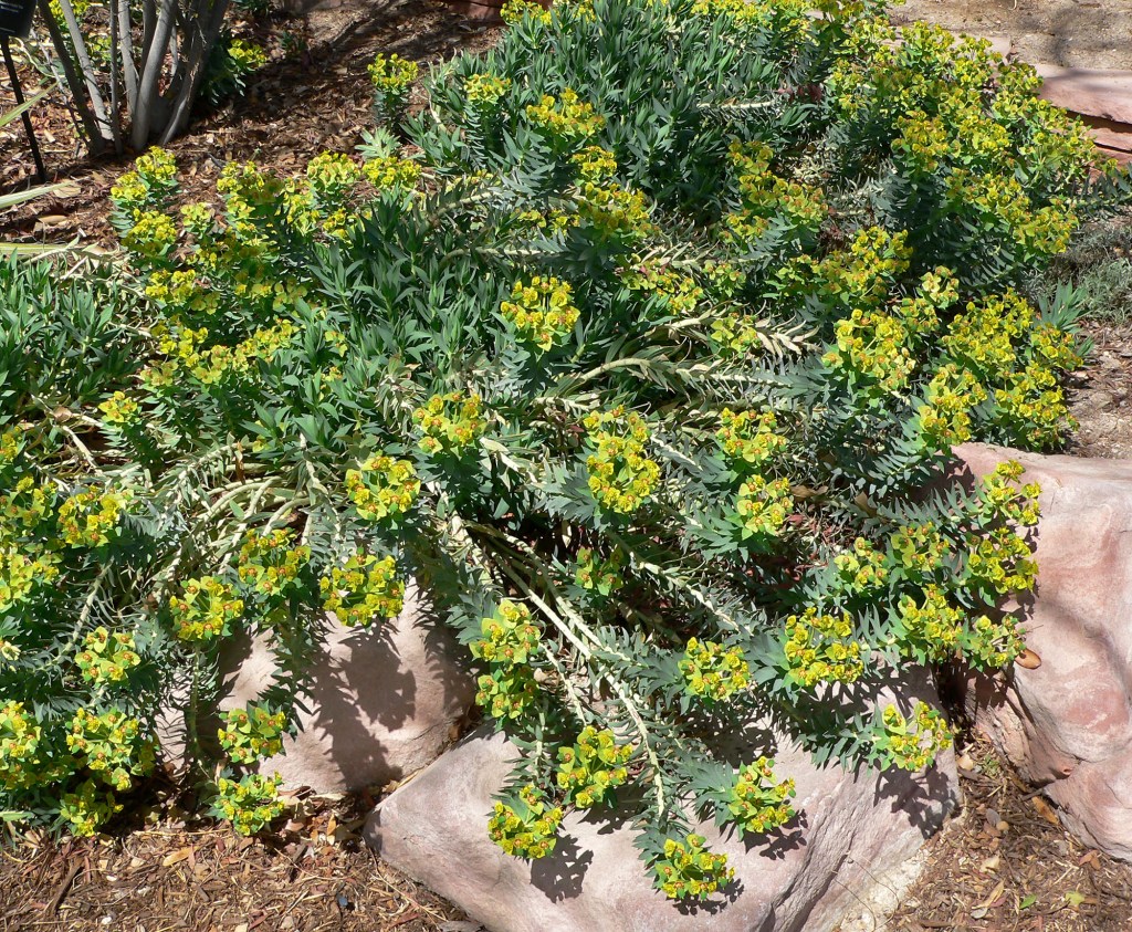 Euphorbia rigida, also known as Blue Euphorbia, displays a unique and captivating appearance with its striking blue-gray leaves and upright growth habit; its architectural form and drought-tolerant nature make it an excellent choice for adding both color and texture to xeriscape gardens.