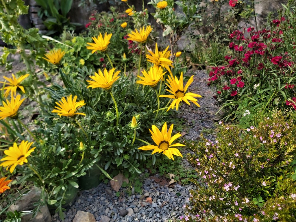 Gazania rigens, commonly known as Treasure Flower or African Daisy, forms a vibrant and colorful groundcover with its bright, daisy-like flowers in a range of hues, including shades of yellow, orange, and pink; its ability to thrive in hot and dry conditions makes it a valuable addition to groundcover plantings, adding a cheerful and low-maintenance splash of color to the landscape.