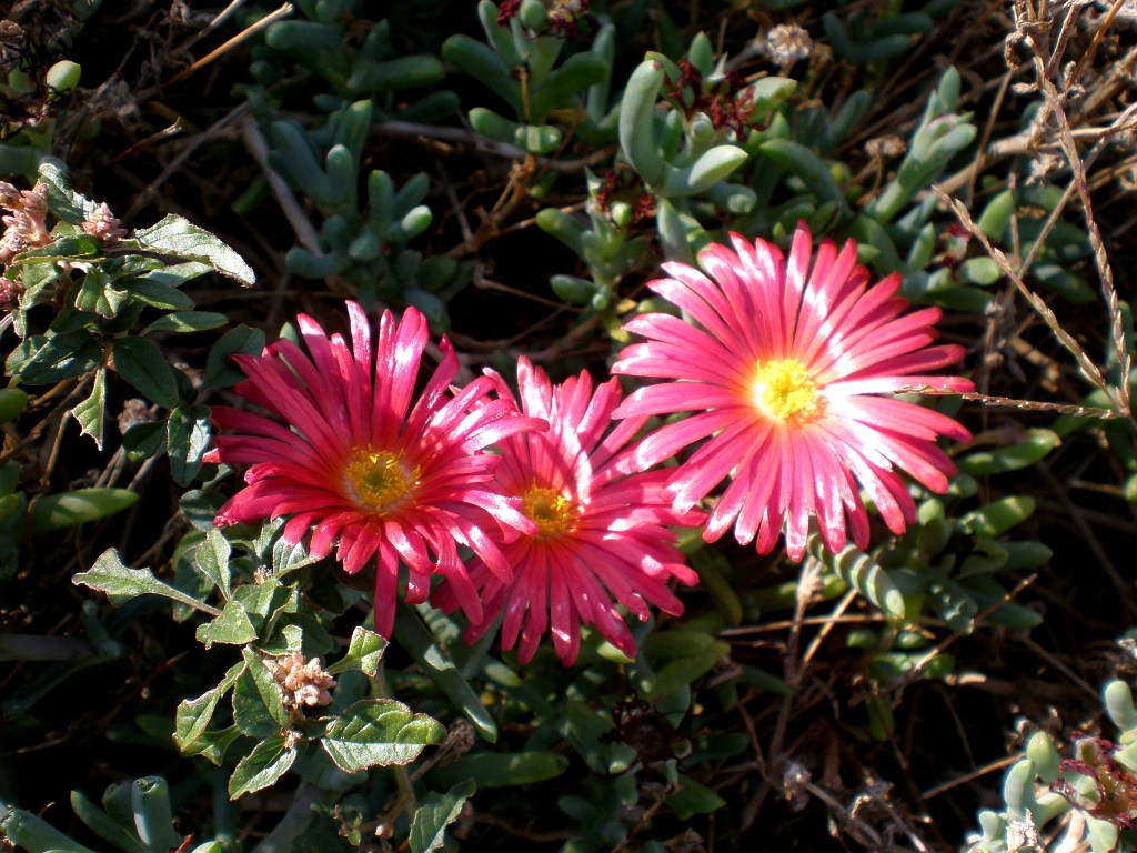 Red Spike Iceplant with its vibrant red-purple flowers and succulent, trailing foliage, creates a striking groundcover that not only adds a splash of color but also offers effective erosion control on slopes, making it a visually appealing and practical choice for sunny, dry areas in the landscape.