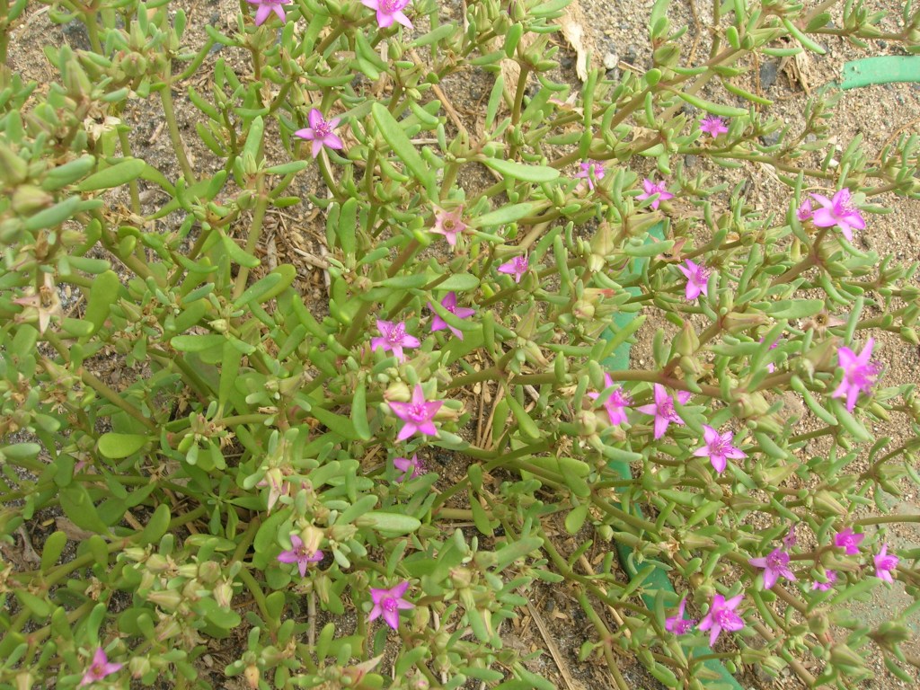 Sesuvium verrucosum, commonly referred to as Sea Purslane, is a succulent groundcover with thick, fleshy leaves and small pink to purple flowers; its salt tolerance and ability to thrive in coastal environments make it an excellent choice for stabilizing sandy or rocky soils and adding a touch of vibrant color to seaside gardens.
