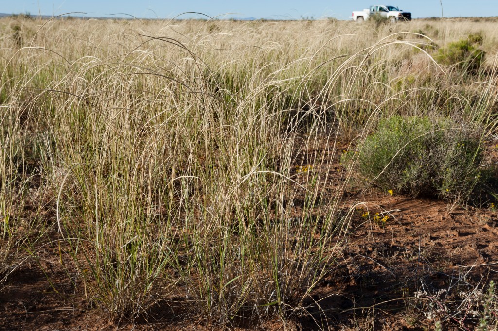 Big Galleta (Hilaria rigida) forms dense clumps of rigid, bluish-green leaves and produces distinctive seedheads, resembling oats, which contribute to its unique textural qualities and make it a valuable grass for erosion control and naturalistic landscapes.