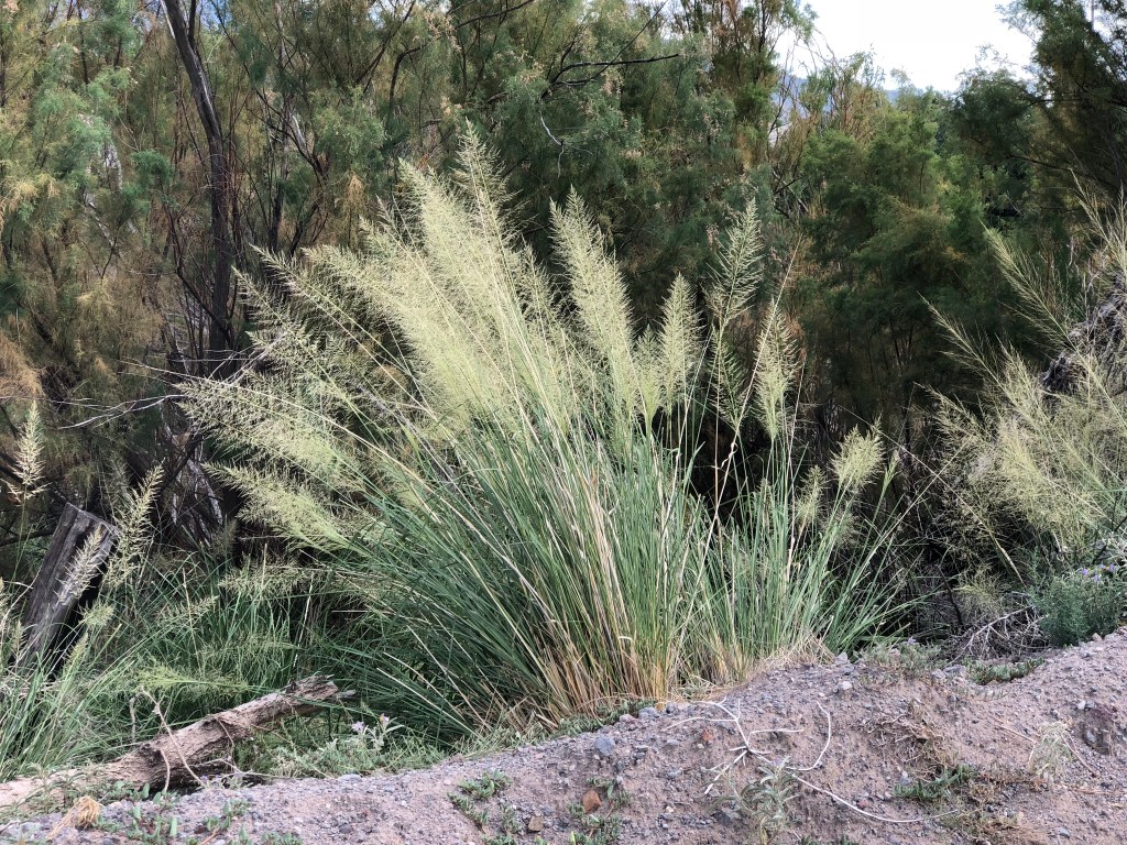 Big Sacaton (Sporobolus wrightii) features tall, stout stems adorned with striking, silvery-blue foliage and feathery flower plumes that can reach impressive heights, often exceeding 6 feet, adding a commanding vertical presence and ornamental allure to native and xeriscape gardens.