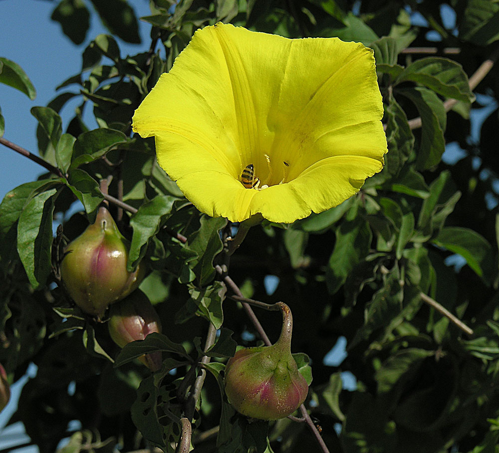 Merremia aurea, commonly known as Yellow Morning Glory, boasts bright and cheerful golden-yellow flowers that illuminate the garden landscape with their vibrant beauty.