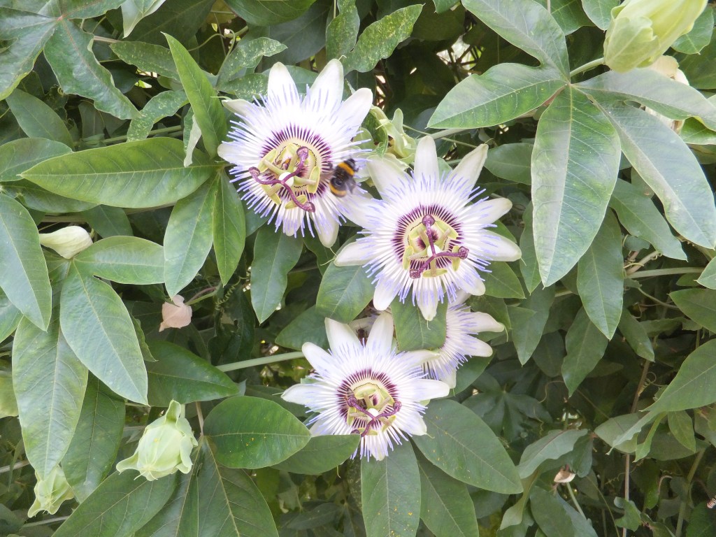 The passionflower vine, with its intricate and exotic blossoms, adds an air of mystery and charm to the garden, attracting both the eye and pollinators with its unique beauty.
