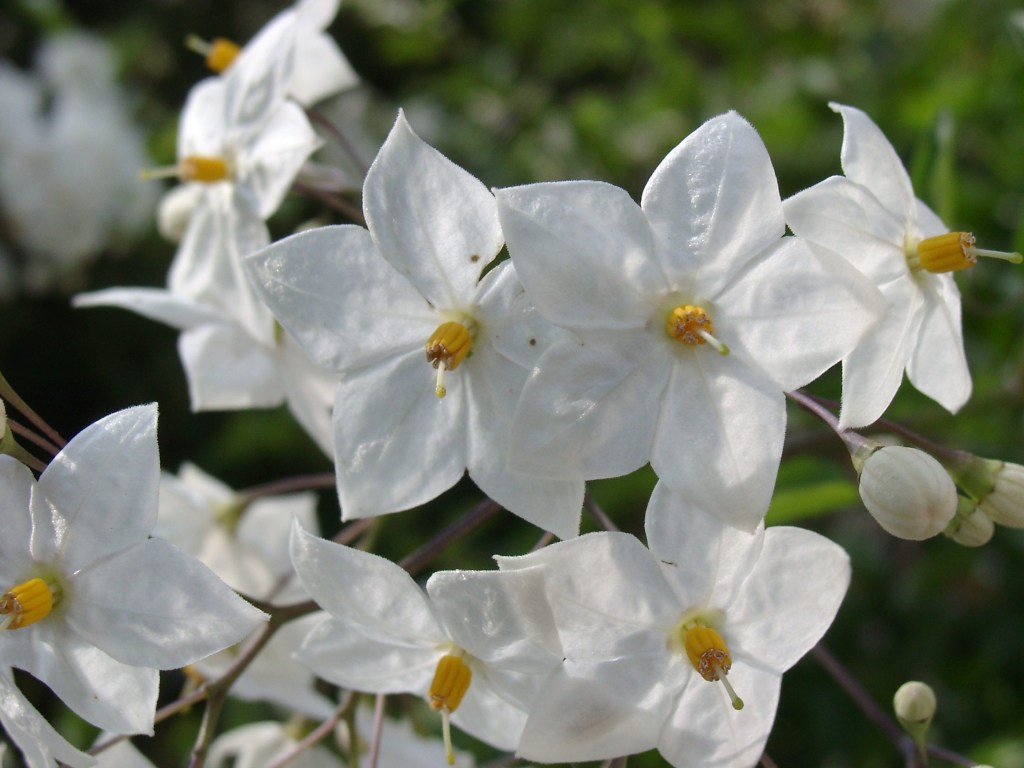 Potato Vine (Solanum jasminoides) is a fast-growing, evergreen vine known for its lush foliage and fragrant, star-shaped white flowers, making it a popular choice for cascading over trellises and fences in gardens.